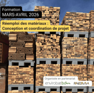 Raediviva en partenariat avec EnvirobatBDM, organise un nouveau format de formation réemploi en 2026. Une formation longue de 6,5 jours étalés sur les mois de mars et avril. Elle s’adresse aux AMO et MOE souhaitant développer l’ensemble des compétences nécessaires pour déployer et mener à bien une opération de réemploi.
